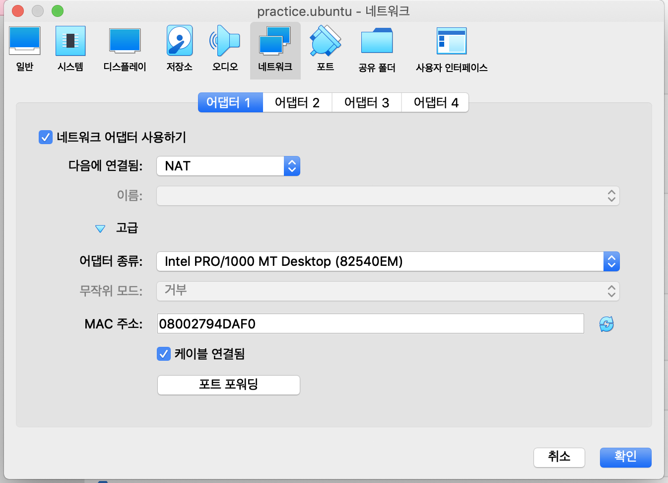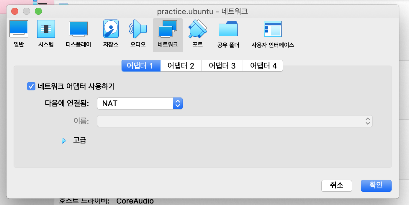 5. 설정의 네트워크로 이동하여 어댑터 1을 NAT으로 설정한다.