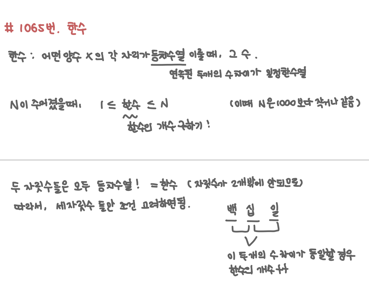 어떤 양의 정수 X의 각 자리가 등차수열을 이룬다면, 그 수를 한수라고 한다. 등차수열은 연속된 두 개의 수의 차이가 일정한 수열을 말한다. N이 주어졌을 때, 1보다 크거나 같고, N보다 작거나
