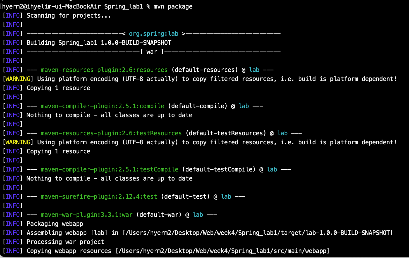 13. 또한 터미널로 해당 프로젝트 폴더에 들어가 mvn package를 실행하면 제대로 실행이 됩니다.