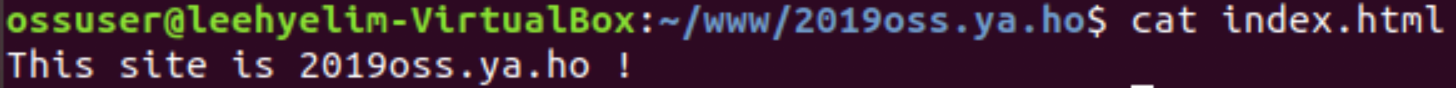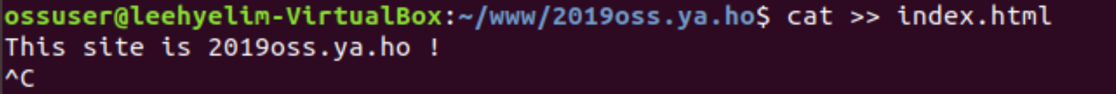 6. cat 명령어를 사용하여, 'index.html' 이라는 텍스트 파일내에 내용을 적는다. 이때 이 내용은 주소를 입력했을 때, 사이트에 띄울 내용이다.