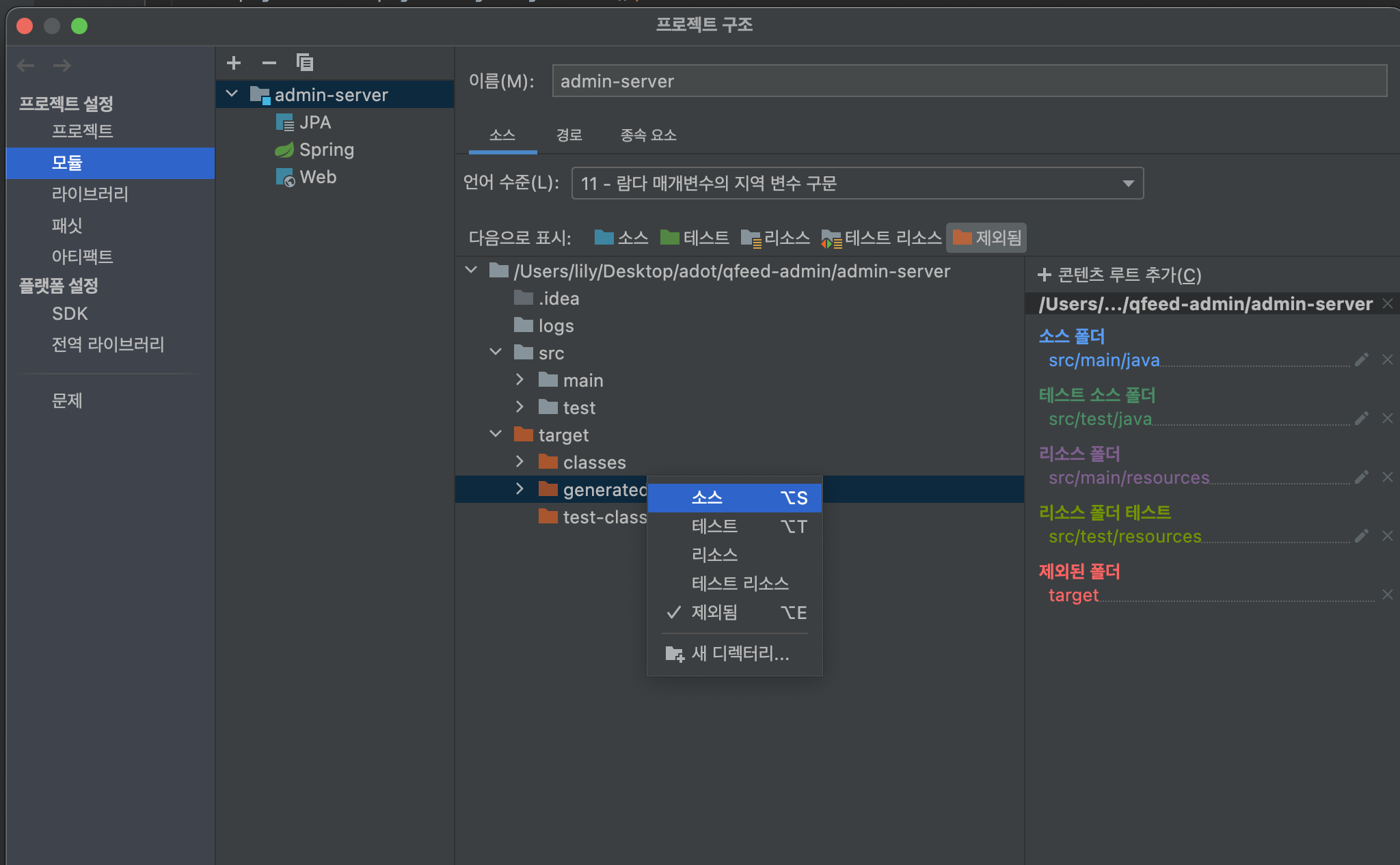 프로젝트의 파일 탭 > 프로젝트 구조 를 클릭하면 아래 창이 뜬다.